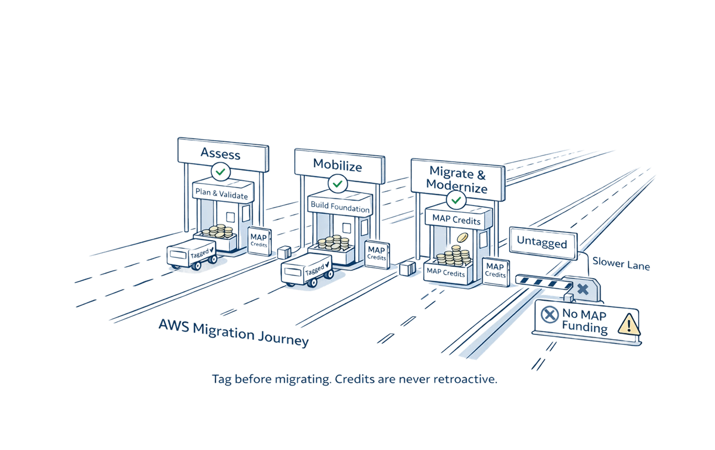 Critical: AWS won't retroactively apply MAP credits. Tag before migration or lose funding permanently.