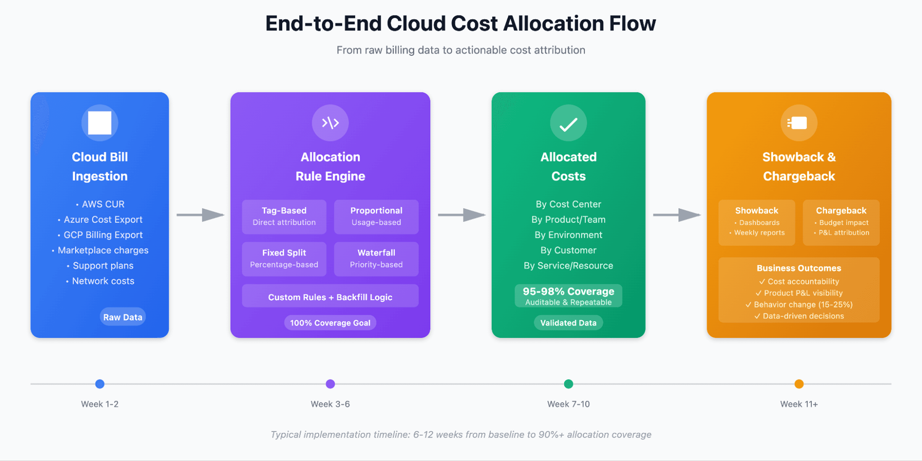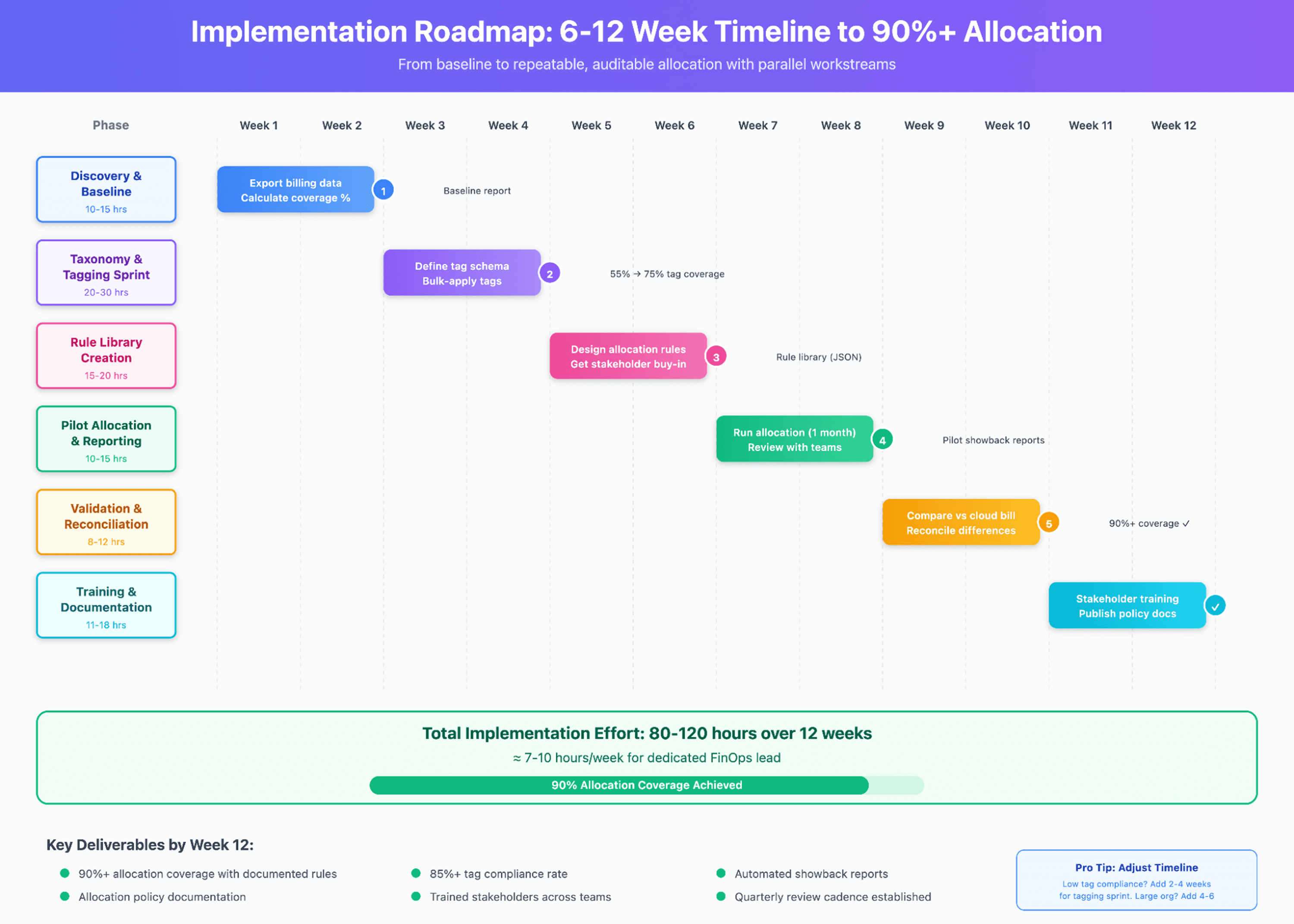 The goal isn't perfection, it's continuous improvement and defensible decision-making. Start with 70% allocation coverage. Get to 90%. Refine your rules quarterly. Invest in governance. Celebrate wins when teams optimize costs because they can finally see them.