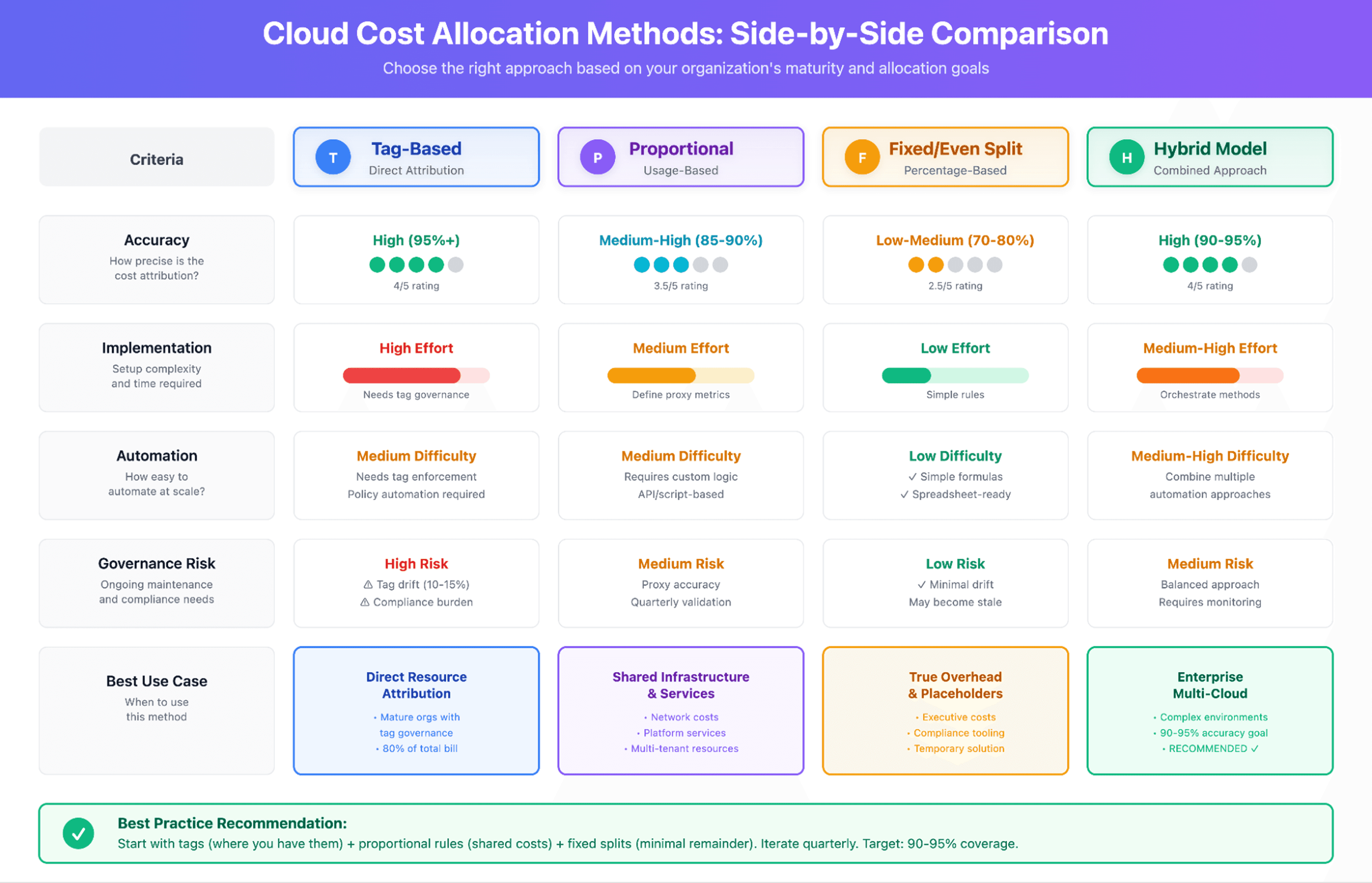 Not all allocation is created equal. The method you choose depends on your organizational maturity, tagging discipline, and tolerance for estimation. Here's the landscape: