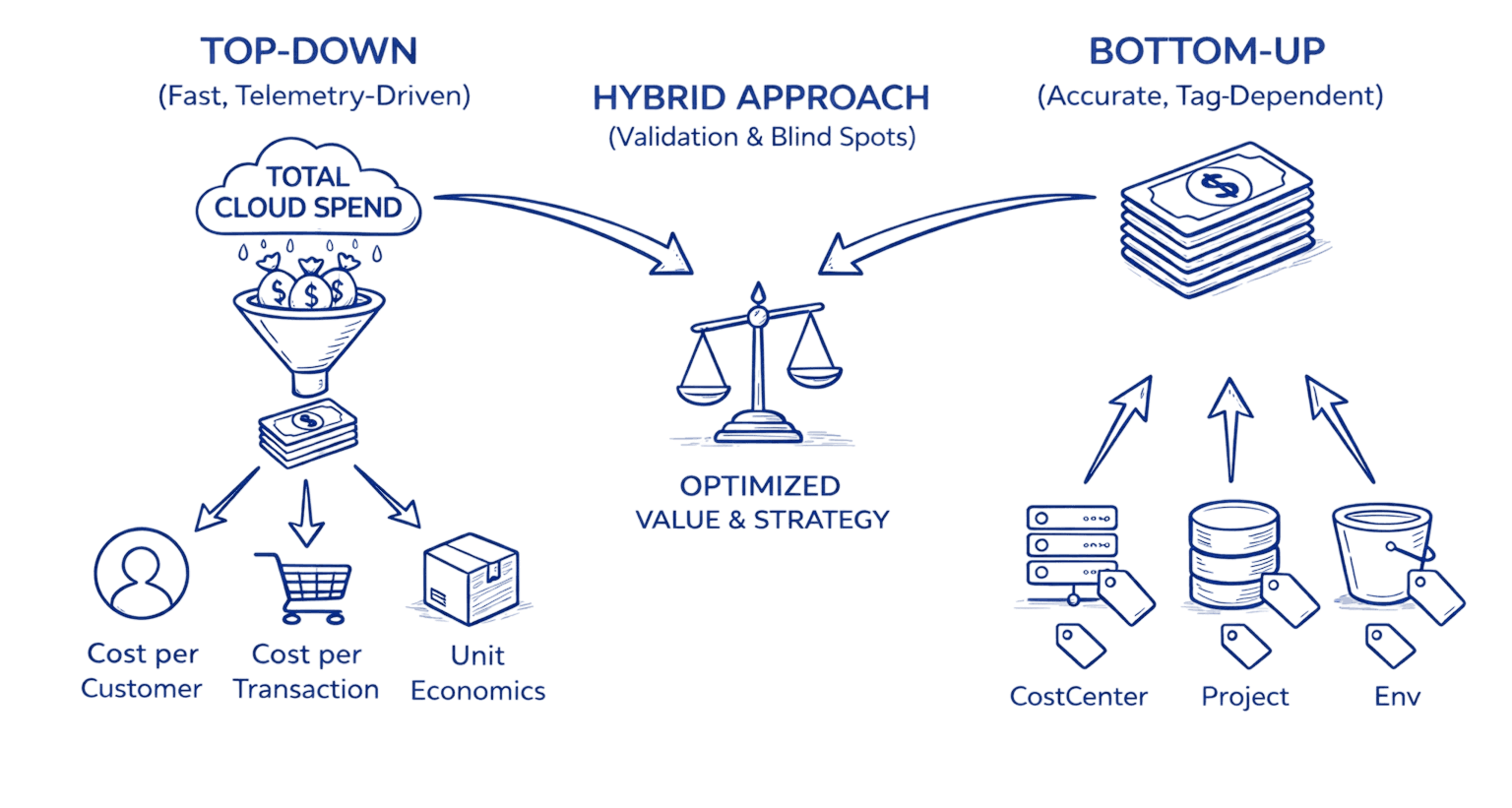 A hybrid model helps validate one approach against the other and exposes blind spots like untagged dev environments or shared infrastructure