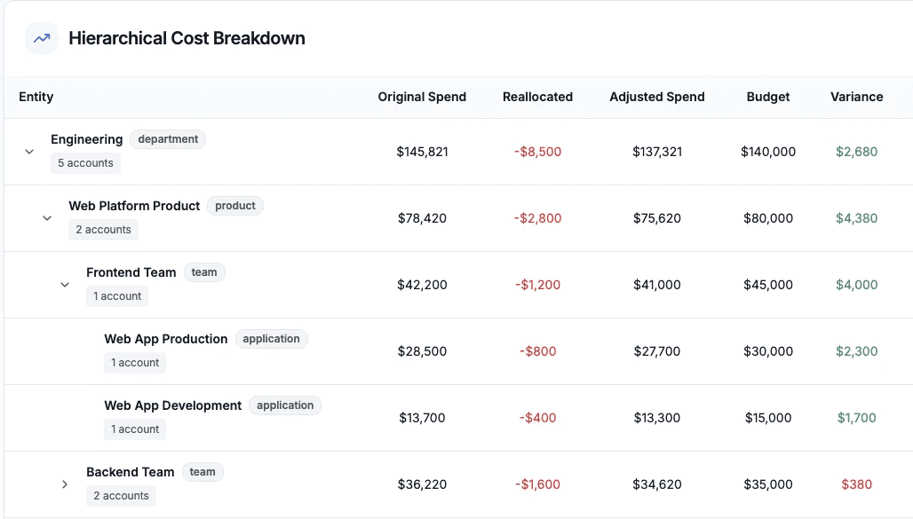 Accurately allocates shared costs, like load balancers and databases, across business units